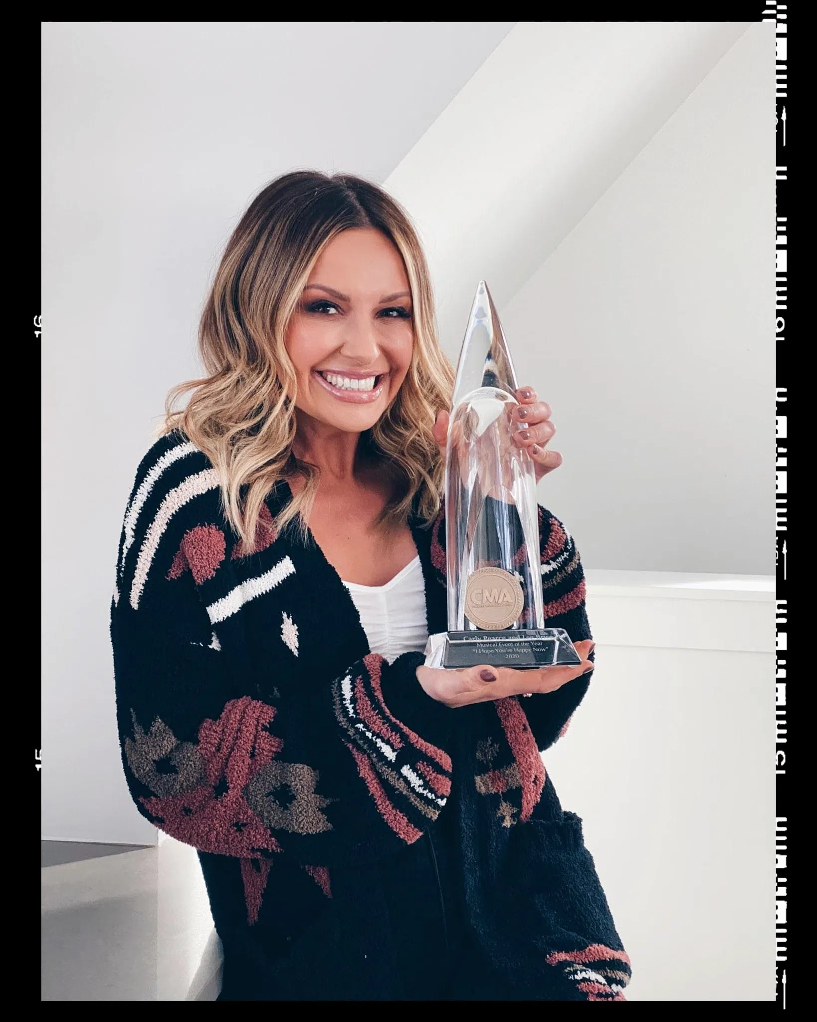 Along with her smiling photo, Carly added “My team surprised me yesterday with this gem. I have dreamt of winning one of these since I was 5 years old, so there were plenty of tears when I held my very own with my name on it in my hands. Thank you country fans & thank you CMA Country Music Association”